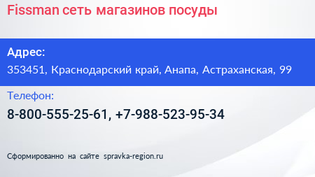 Fissman, сеть магазинов посуды по адресу 353451, Краснодарский край, Анапа, Астраханская, 99 в дальнейшем Организация, размещена в следующих категориях: