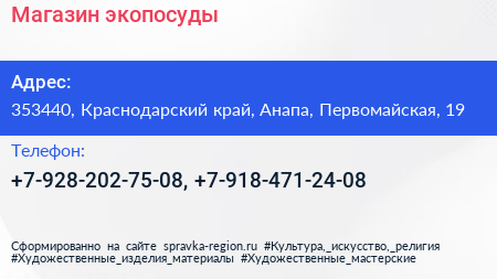Магазин экопосуды по адресу 353440, Краснодарский край, Анапа, Первомайская, 19 в дальнейшем Организация, размещена в следующих категориях: