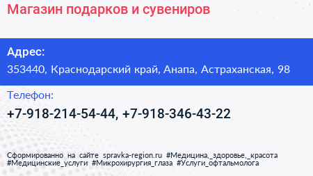 Магазин подарков и сувениров по адресу 353440, Краснодарский край, Анапа, Астраханская, 98 в дальнейшем Организация, размещена в следующих категориях: