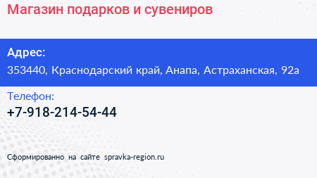 Магазин подарков и сувениров по адресу 353440, Краснодарский край, Анапа, Астраханская, 92а в дальнейшем Организация, размещена в следующих категориях: