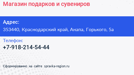 Магазин подарков и сувениров по адресу 353440, Краснодарский край, Анапа, Горького, 5а в дальнейшем Организация, размещена в следующих категориях: