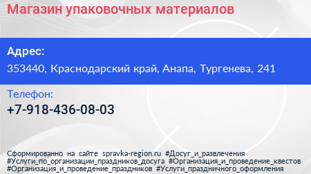 Магазин упаковочных материалов по адресу 353440, Краснодарский край, Анапа, Тургенева, 241 в дальнейшем Организация, размещена в следующих категориях: