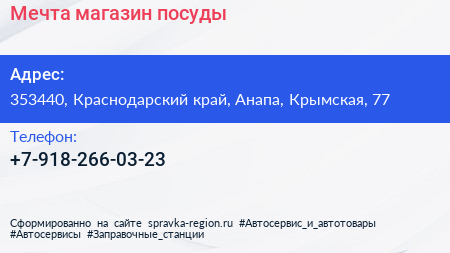 Мечта, магазин посуды по адресу 353440, Краснодарский край, Анапа, Крымская, 77 в дальнейшем Организация, размещена в следующих категориях: