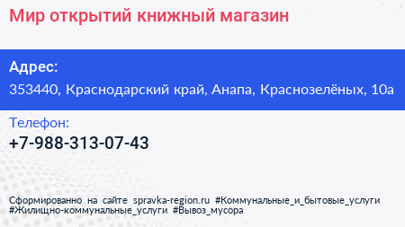 Мир открытий, книжный магазин по адресу 353440, Краснодарский край, Анапа, Краснозелёных, 10а в дальнейшем Организация, размещена в следующих категориях: