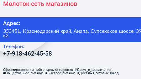 Молоток, сеть магазинов по адресу 353451, Краснодарский край, Анапа, Супсехское шоссе, 39 к2 в дальнейшем Организация, размещена в следующих категориях: