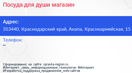 Посуда для души, магазин по адресу 353440, Краснодарский край, Анапа, Красноармейская, 15 в дальнейшем Организация, размещена в следующих категориях: