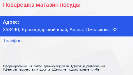 Поварешка, магазин посуды по адресу 353440, Краснодарский край, Анапа, Омелькова, 32 в дальнейшем Организация, размещена в следующих категориях: