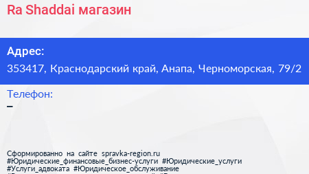 Ra Shaddai, магазин по адресу 353417, Краснодарский край, Анапа, Черноморская, 79/2 в дальнейшем Организация, размещена в следующих категориях:
