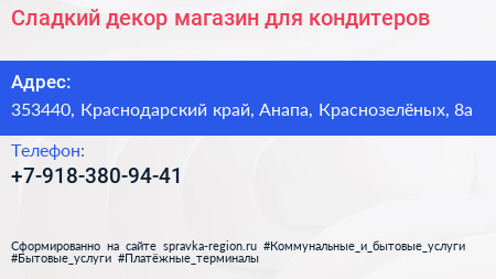Сладкий декор, магазин для кондитеров по адресу 353440, Краснодарский край, Анапа, Краснозелёных, 8а в дальнейшем Организация, размещена в следующих категориях: