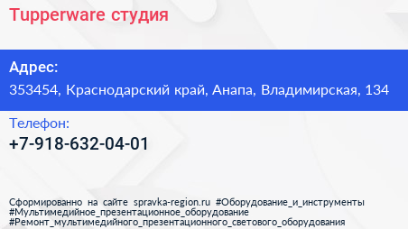 Tupperware, студия по адресу 353454, Краснодарский край, Анапа, Владимирская, 134 в дальнейшем Организация, размещена в следующих категориях: