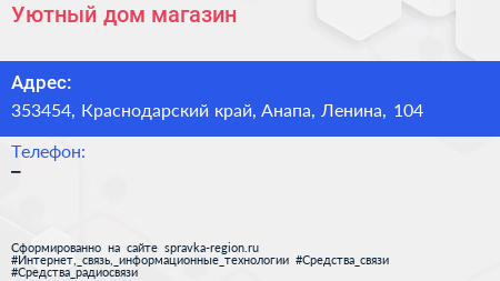 Уютный дом, магазин по адресу 353454, Краснодарский край, Анапа, Ленина, 104 в дальнейшем Организация, размещена в следующих категориях: