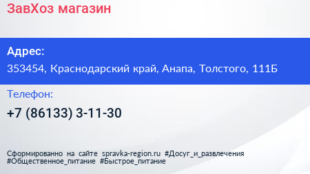 ЗавХоз, магазин по адресу 353454, Краснодарский край, Анапа, Толстого, 111Б в дальнейшем Организация, размещена в следующих категориях: