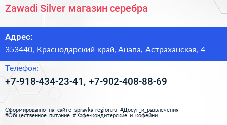 Zawadi Silver, магазин серебра по адресу 353440, Краснодарский край, Анапа, Астраханская, 4 в дальнейшем Организация, размещена в следующих категориях: