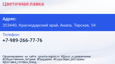 Цветочная лавка по адресу 353440, Краснодарский край, Анапа, Терская, 54 в дальнейшем Организация, размещена в следующих категориях: