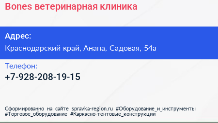 Bones, ветеринарная клиника по адресу Краснодарский край, Анапа, Садовая, 54а в дальнейшем Организация, размещена в следующих категориях: