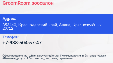 GroomRoom, зоосалон по адресу 353440, Краснодарский край, Анапа, Краснозелёных, 29/12 в дальнейшем Организация, размещена в следующих категориях: