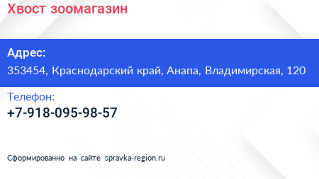Хвост, зоомагазин по адресу 353454, Краснодарский край, Анапа, Владимирская, 120 в дальнейшем Организация, размещена в следующих категориях: