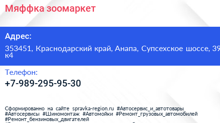 Мяффка, зоомаркет по адресу 353451, Краснодарский край, Анапа, Супсехское шоссе, 39 к4 в дальнейшем Организация, размещена в следующих категориях:
