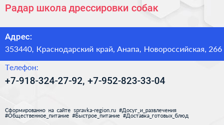 Радар, школа дрессировки собак по адресу 353440, Краснодарский край, Анапа, Новороссийская, 266 в дальнейшем Организация, размещена в следующих категориях: