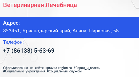 Ветеринарная Лечебница по адресу 353451, Краснодарский край, Анапа, Парковая, 58 в дальнейшем Организация, размещена в следующих категориях:
