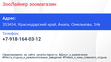 ЗооЛайнер, зоомагазин по адресу 353454, Краснодарский край, Анапа, Омелькова, 14в в дальнейшем Организация, размещена в следующих категориях: