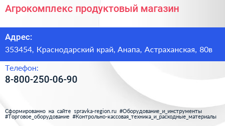 Агрокомплекс, продуктовый магазин по адресу 353454, Краснодарский край, Анапа, Астраханская, 80в в дальнейшем Организация, размещена в следующих категориях: