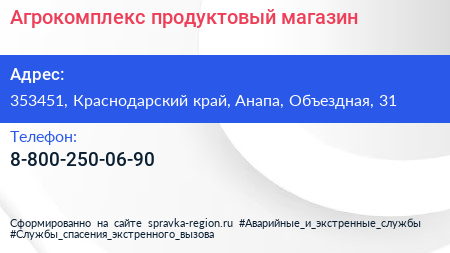 Агрокомплекс, продуктовый магазин по адресу 353451, Краснодарский край, Анапа, Объездная, 31 в дальнейшем Организация, размещена в следующих категориях: