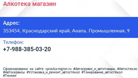 Алкотека, магазин по адресу 353454, Краснодарский край, Анапа, Промышленная, 9 в дальнейшем Организация, размещена в следующих категориях: