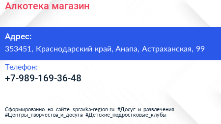 Алкотека, магазин по адресу 353451, Краснодарский край, Анапа, Астраханская, 99 в дальнейшем Организация, размещена в следующих категориях: