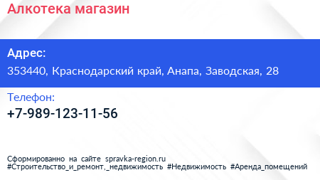 Алкотека, магазин по адресу 353440, Краснодарский край, Анапа, Заводская, 28 в дальнейшем Организация, размещена в следующих категориях: