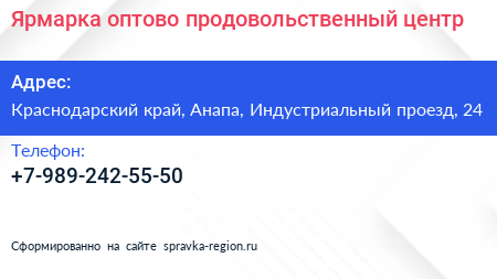 Ярмарка, оптово-продовольственный центр по адресу Краснодарский край, Анапа, Индустриальный проезд, 24 в дальнейшем Организация, размещена в следующих категориях: