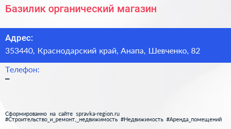 Базилик, органический магазин по адресу 353440, Краснодарский край, Анапа, Шевченко, 82 в дальнейшем Организация, размещена в следующих категориях: