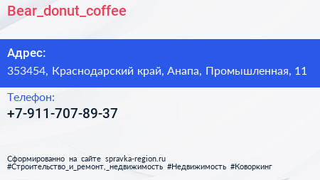 Bear_donut_coffee по адресу 353454, Краснодарский край, Анапа, Промышленная, 11 в дальнейшем Организация, размещена в следующих категориях: