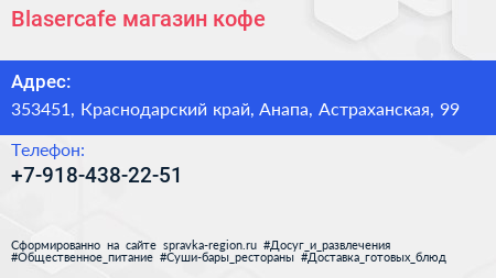 Blasercafe, магазин кофе по адресу 353451, Краснодарский край, Анапа, Астраханская, 99 в дальнейшем Организация, размещена в следующих категориях: