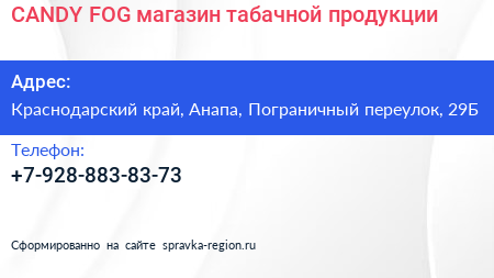 CANDY FOG, магазин табачной продукции по адресу Краснодарский край, Анапа, Пограничный переулок, 29Б в дальнейшем Организация, размещена в следующих категориях: