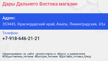 Дары Дальнего Востока, магазин по адресу 353445, Краснодарский край, Анапа, Ленинградская, 61а в дальнейшем Организация, размещена в следующих категориях: