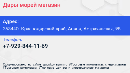Дары морей, магазин по адресу 353440, Краснодарский край, Анапа, Астраханская, 98 в дальнейшем Организация, размещена в следующих категориях:
