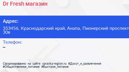 Dr.Fresh, магазин по адресу 353456, Краснодарский край, Анапа, Пионерский проспект, 30в в дальнейшем Организация, размещена в следующих категориях: