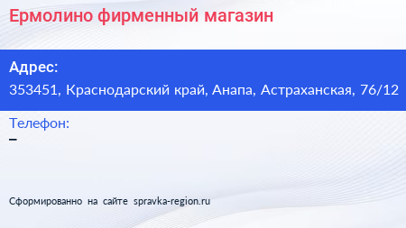Ермолино, фирменный магазин по адресу 353451, Краснодарский край, Анапа, Астраханская, 76/12 в дальнейшем Организация, размещена в следующих категориях: