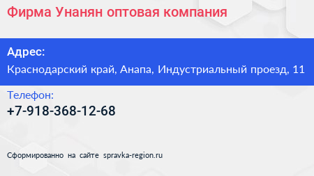 Фирма Унанян, оптовая компания по адресу Краснодарский край, Анапа, Индустриальный проезд, 11 в дальнейшем Организация, размещена в следующих категориях: