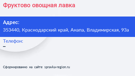Фруктово-овощная лавка по адресу 353440, Краснодарский край, Анапа, Владимирская, 93а в дальнейшем Организация, размещена в следующих категориях: