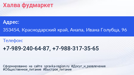 Халва, фудмаркет по адресу 353454, Краснодарский край, Анапа, Ивана Голубца, 96 в дальнейшем Организация, размещена в следующих категориях: