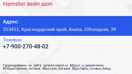 Hamster, вейп-шоп по адресу 353451, Краснодарский край, Анапа, Объездная, 39 в дальнейшем Организация, размещена в следующих категориях: