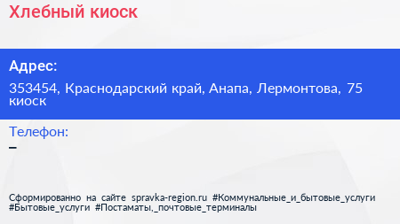 Хлебный киоск по адресу 353454, Краснодарский край, Анапа, Лермонтова, 75 киоск в дальнейшем Организация, размещена в следующих категориях: