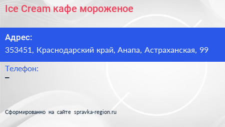 Ice Cream, кафе-мороженое по адресу 353451, Краснодарский край, Анапа, Астраханская, 99 в дальнейшем Организация, размещена в следующих категориях: