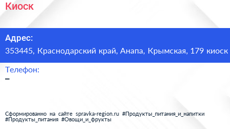 Киоск по адресу 353445, Краснодарский край, Анапа, Крымская, 179 киоск в дальнейшем Организация, размещена в следующих категориях: