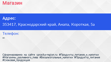 Магазин по адресу 353417, Краснодарский край, Анапа, Короткая, 5а в дальнейшем Организация, размещена в следующих категориях: