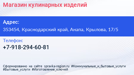 Магазин кулинарных изделий по адресу 353454, Краснодарский край, Анапа, Крылова, 17/5 в дальнейшем Организация, размещена в следующих категориях: