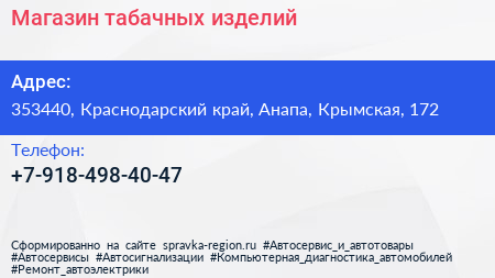 Магазин табачных изделий по адресу 353440, Краснодарский край, Анапа, Крымская, 172 в дальнейшем Организация, размещена в следующих категориях: