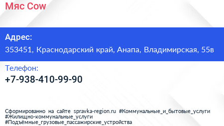 Мяс & Cow по адресу 353451, Краснодарский край, Анапа, Владимирская, 55в в дальнейшем Организация, размещена в следующих категориях: